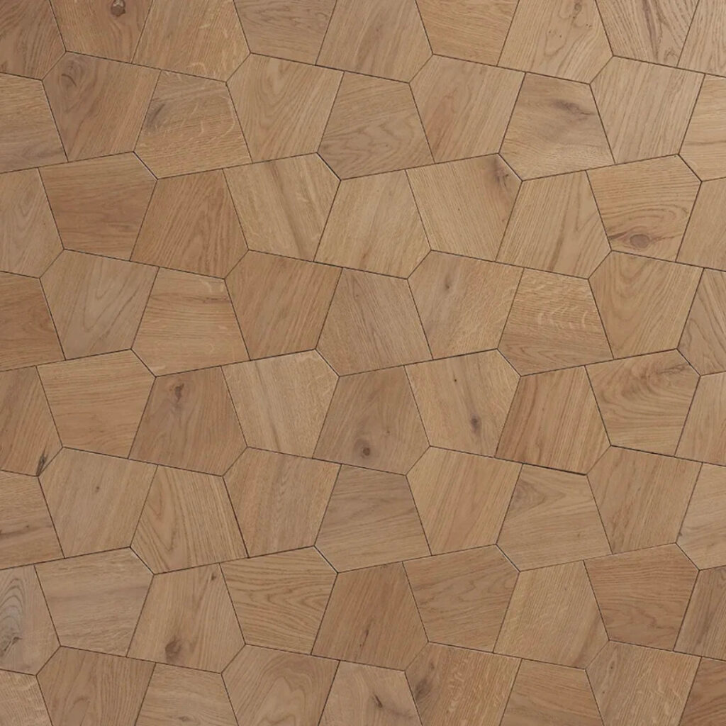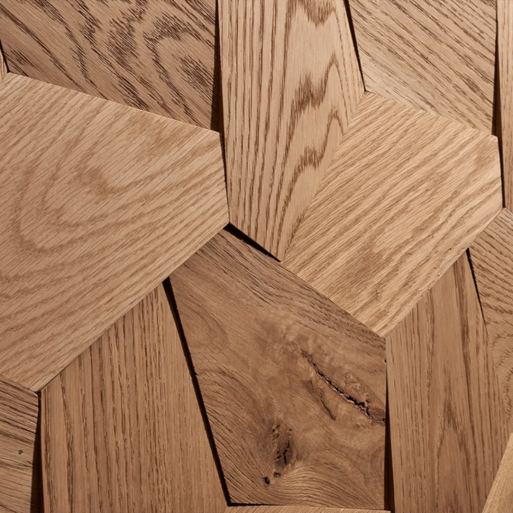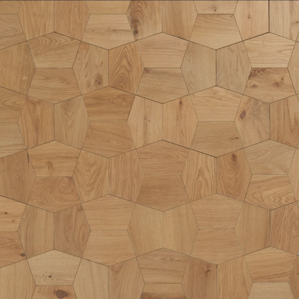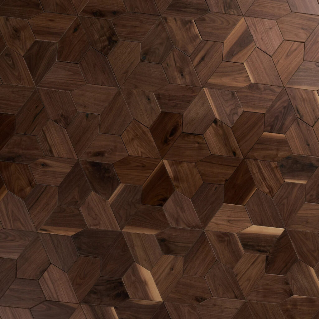 Five-sided petals join to resemble a flower, repeating nonlinearly in a rhythmic and dynamic visual across a surface. Each pattern of the Motif Collection is offered in a flat version for the floor or wall, and a dimensional version for the wall, designed for extraordinary and seamless textures to continue across surfaces.
