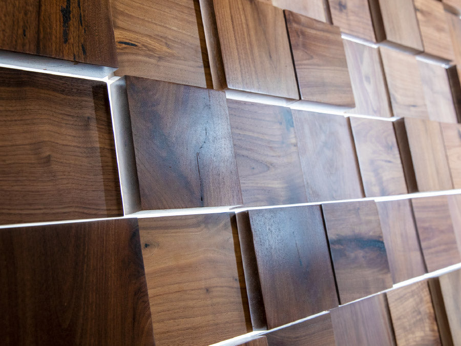A split in the center with one side elevated creates a unique visual of shadows from the hexagon shape. Joined and finished by hand and designed in Southern California.