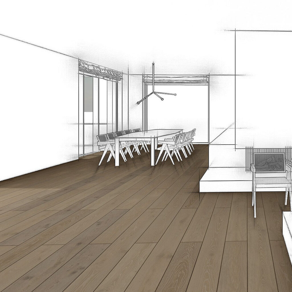 Mid-tone full, rich brown. DUCHATEAU joins with world renowned interior designer MARTYN LAWRENCE BULLARD to create a hardwood flooring collection inspired by modern and classical architects. Impeccable finishes, rooted in design tradition, reinvented for today. European white oak 9.5″ (240 mm) wide plank. Offered in a coordinating chevron. For Chevron Specifications: Click Here
