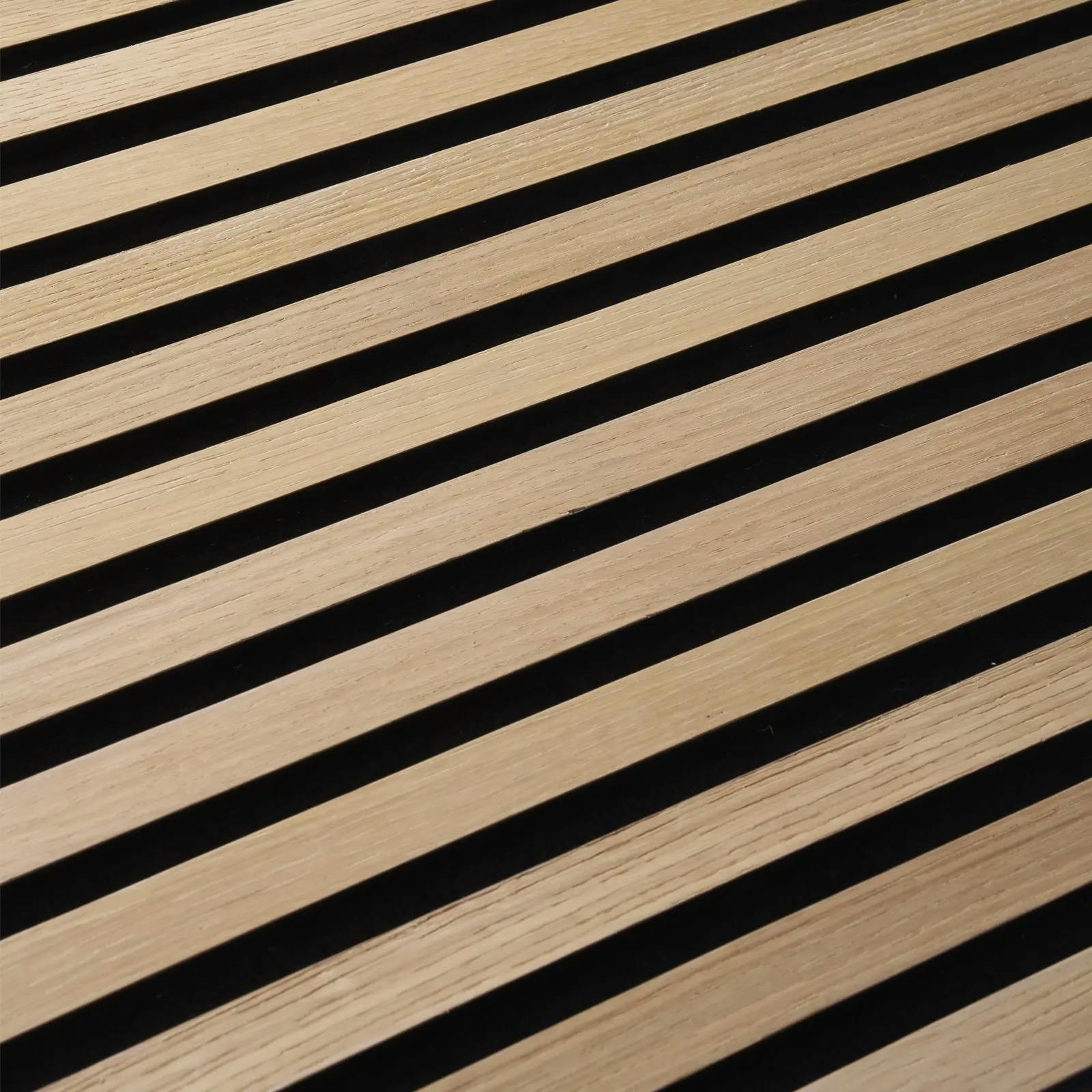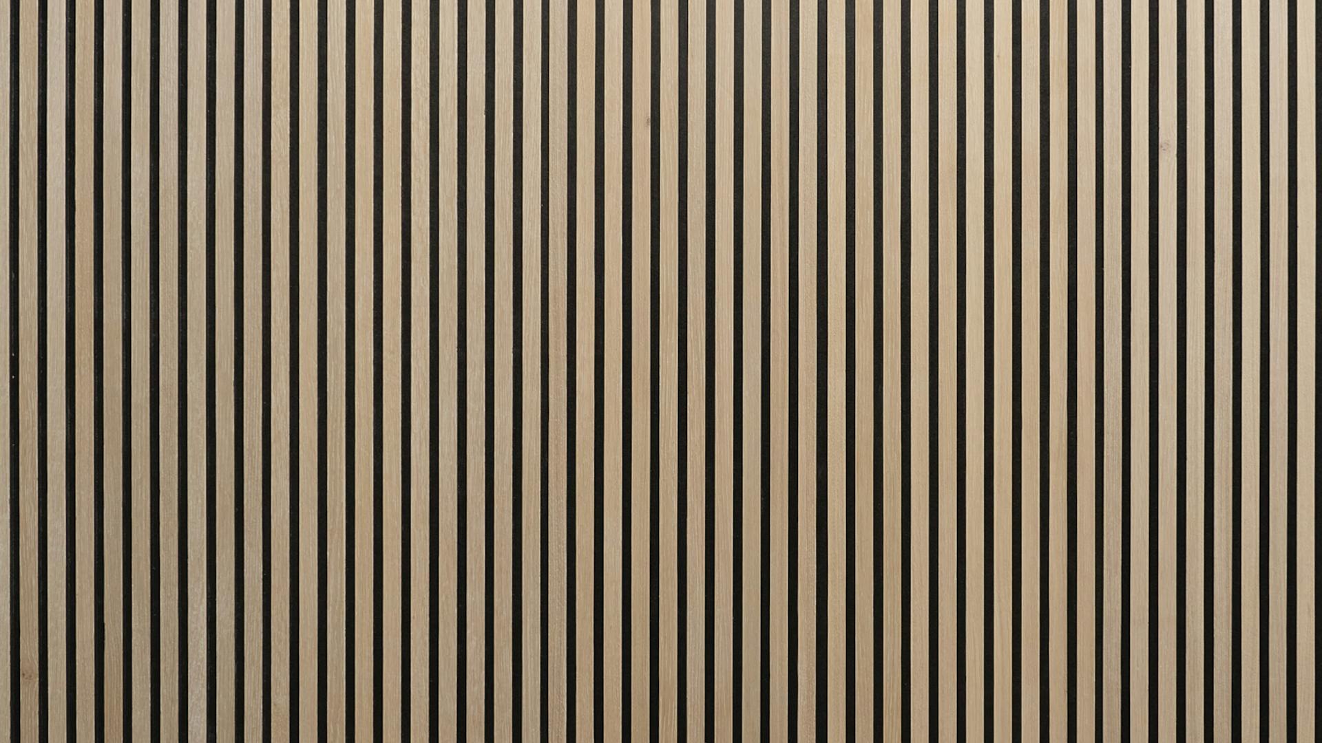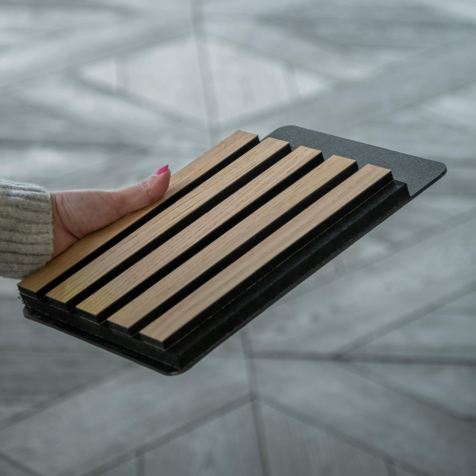 Lacquer finished veneer serves as a canvas for wood visuals in five colors. A felt backing insulates sound and deepens the contrast in its visual impact.