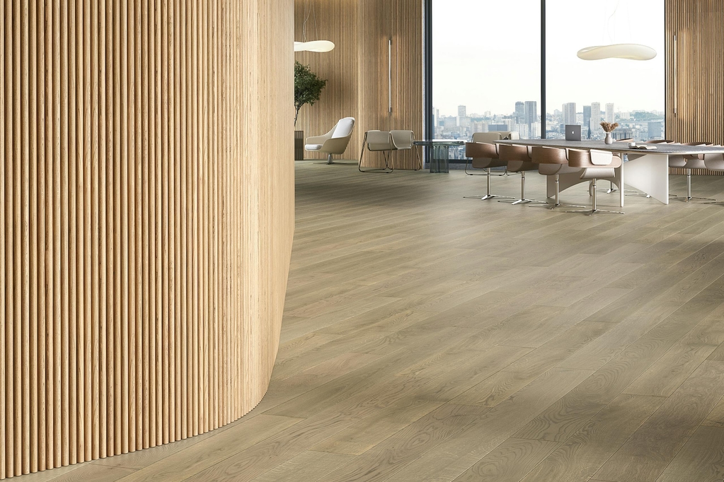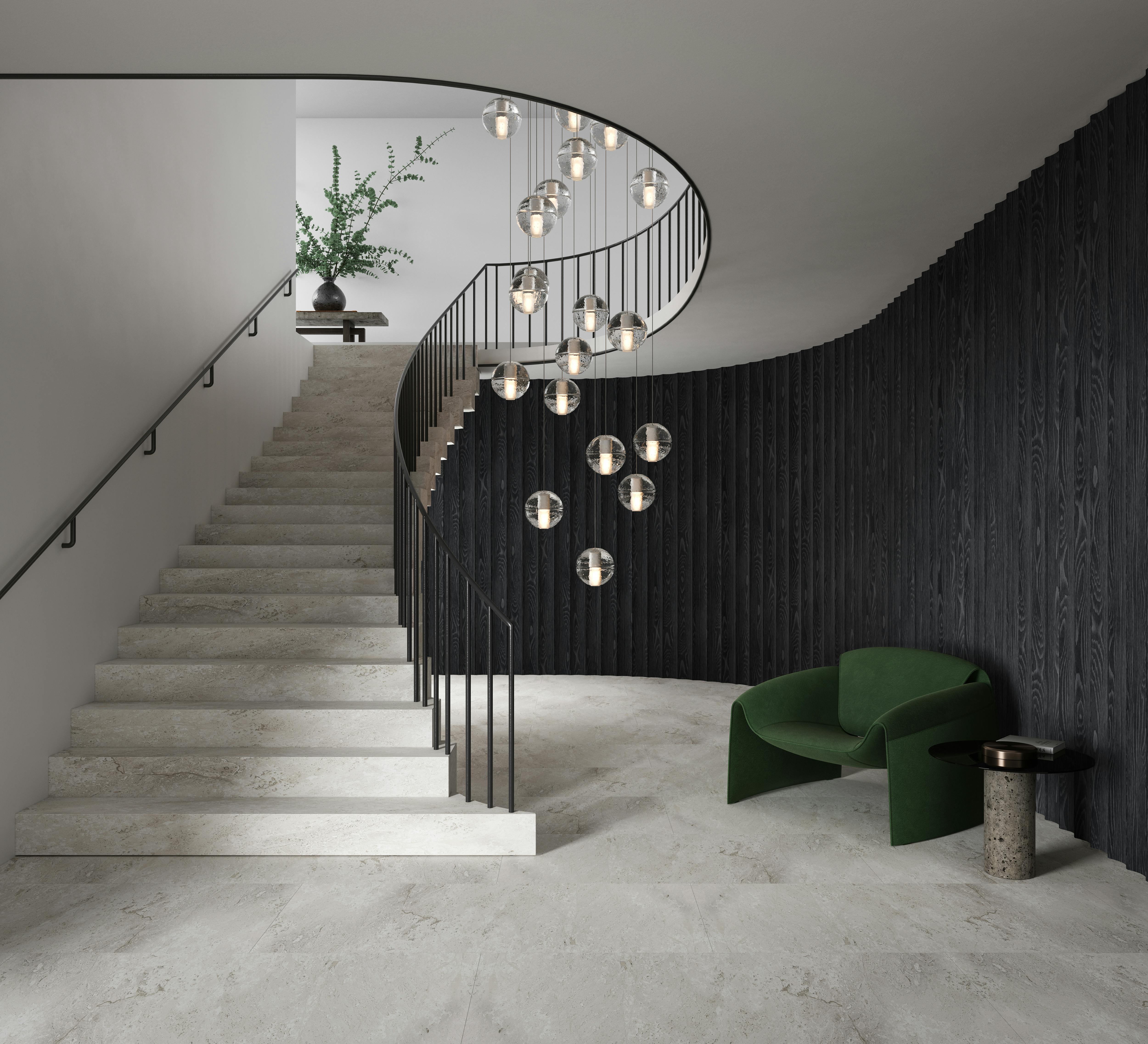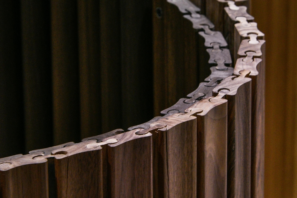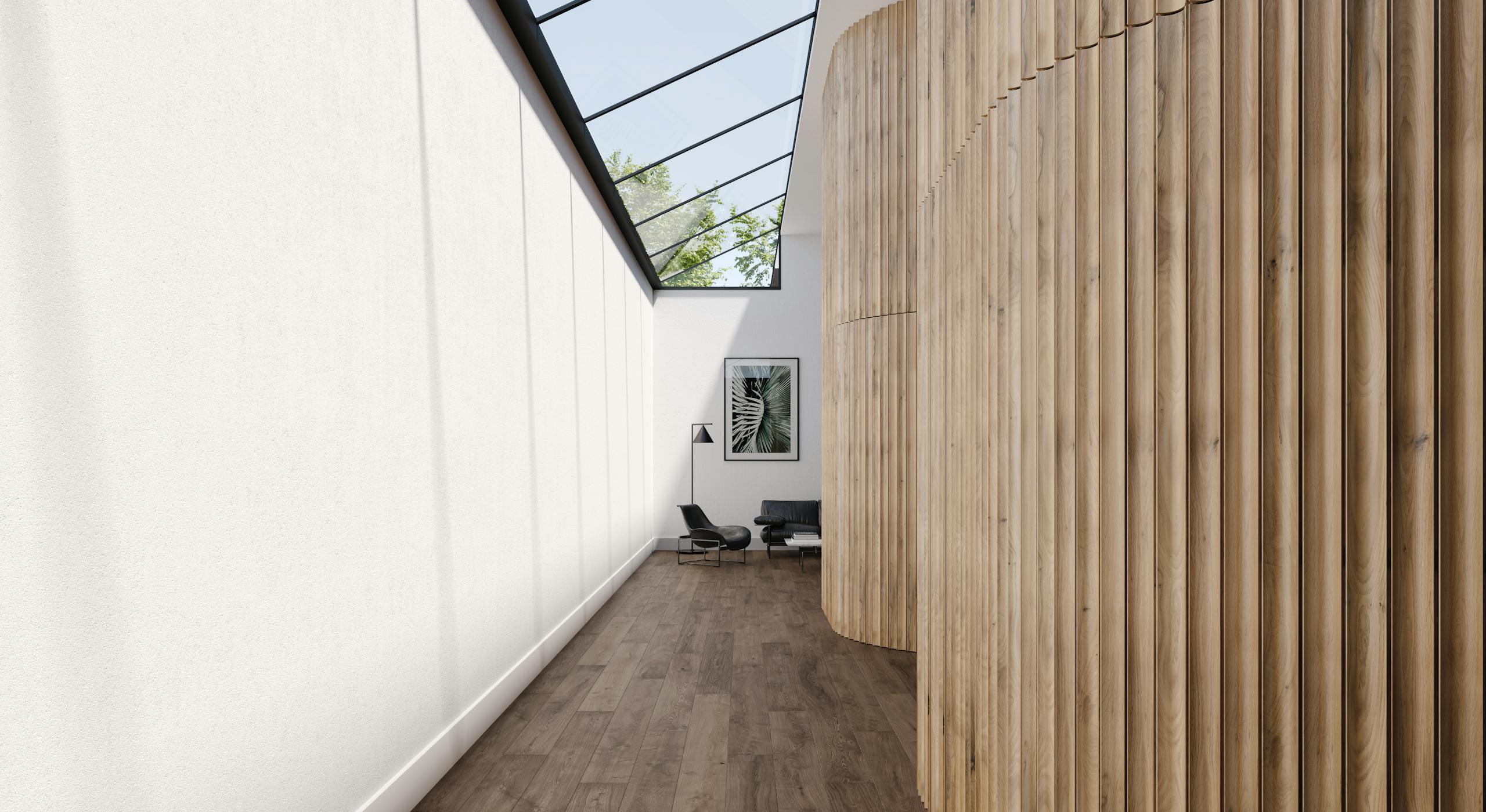 An architectural spectacle, Grande Courbe’s sweeping curves highlight extraordinary grain visuals, offering an unmatched depth of concave texture. Shadows can enhance striking contrasts when Grande dialogues with daylight. Offered in flat panel and flexible link versions.