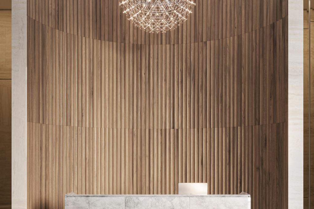 Petite Courbe is a subtler concave design with finer fluting and narrower expressions of wood grain. Petite’s softer interplay with light is especially versatile in defining spaces, offering refinement and depth without overwhelming the aesthetic. Offered in flat panel and flexible link versions.